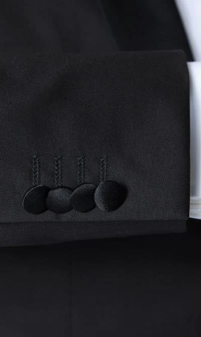 Details zum Sakko: Gerade geschnitten, Schalkragen, Ein-Knopf-Sakko, Einreiher, Brustleistentasche, Paspeltasche/n, Zierschlitz mit Kissing Buttons, Paspeltasche/n innen