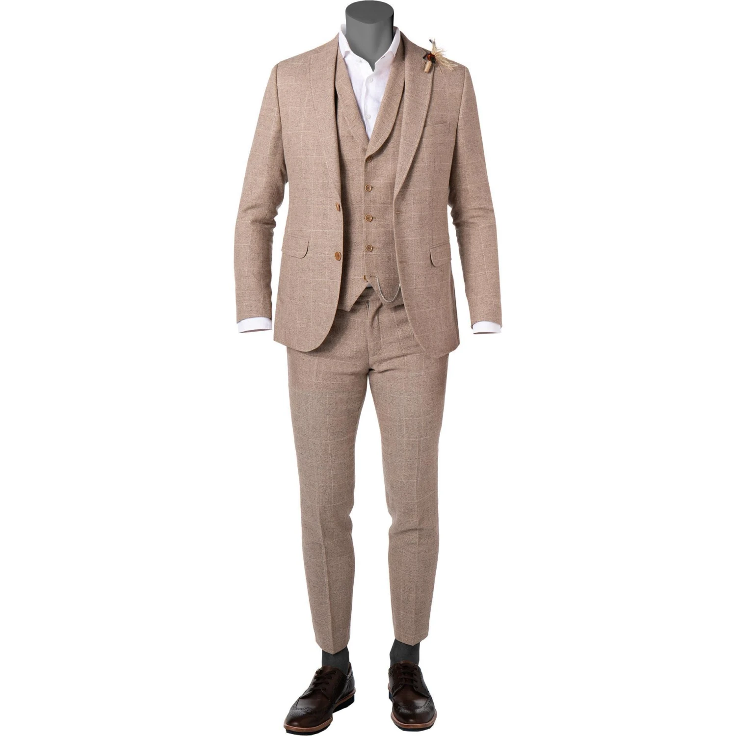 Dieses schicke Trio präsentiert sich klassisch in einem dezenten Karo-Muster und sorgt mit einer schmalen Passform für eine schlanke Silhouette. Modische Akzente werden hier mit Federanstecker sowie einer Zierkette akzentuiert. Setzen Sie Ihren individuellen und charismatischen Look auf besonderen Events gekonnt in Szene!