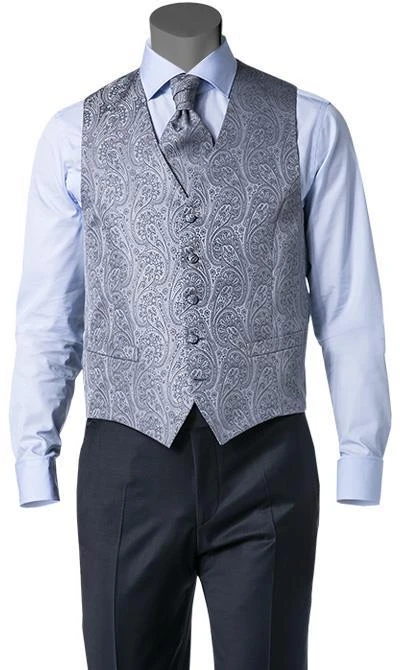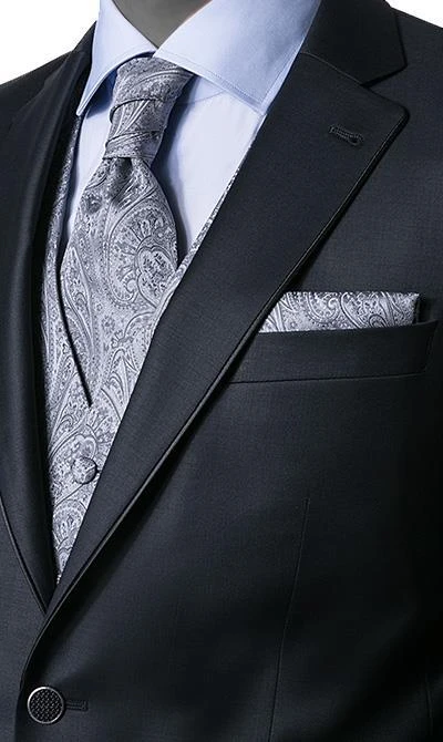 Dieses perfekt abgestimmte Ensemble präsentiert sich geschmackvoll und charmant. Anzug mit Weste, Plastron und Einstecktuch in harmonischen Farbtönen sorgen für ein stilvolles Miteinander. Ob Hochzeit oder festliche Anlässe mit diesen edlen Begleiter und Accessoire sind Sie ein Blickfang.