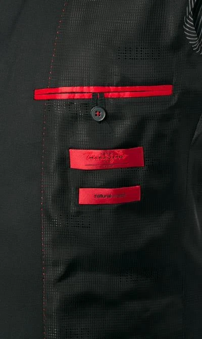 Details zum Sakko: Schmal geschnitten, Tailliert, Reverskragen, Zwei-Knopf-Sakko, Einreiher, Brustleistentasche schmal, Paspelierte Pattentasche/n, Doppelschlitze, Zierschlitz mit Kissing Buttons, Paspeltasche/n innen links eine rote, Tasche/n mit Knopf und Lasche innen rechts eine rote