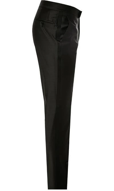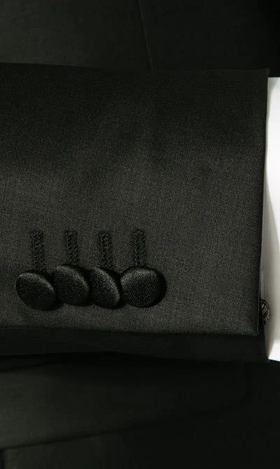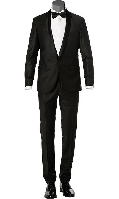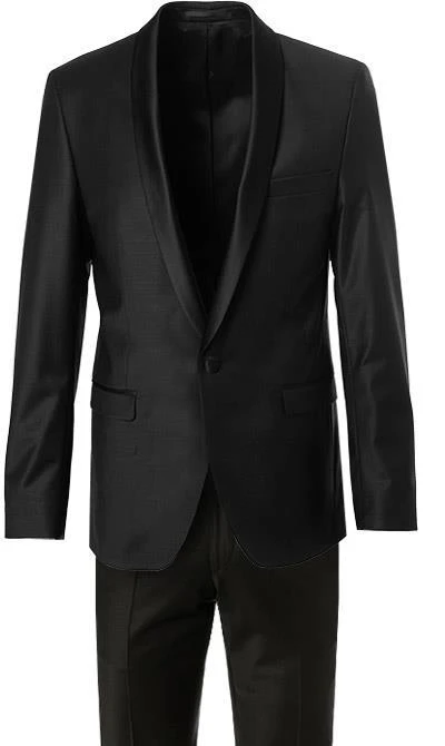 Besonderheiten: Kontrastdetails aus Satin: Schalkragen, Taschenpaspel, überzogene Knöpfe, seitliche Gallonstreifen an der Hose