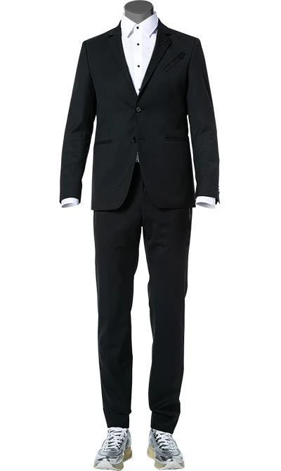 Stylish und Clean: Dieser Anzug erfüllt Ihre modischen Ansprüche. Hochwertig verarbeitet und aus Schurwoll-Stretch in Twill-Qualität präsentiert sich der Zweiteiler. Eine sehr schmale Passform bringt die schlanke Figur optimal zur Geltung. Logo-Details an Taschen, Revers und ein elastischer Bund unterstreichen den extravaganten Look.