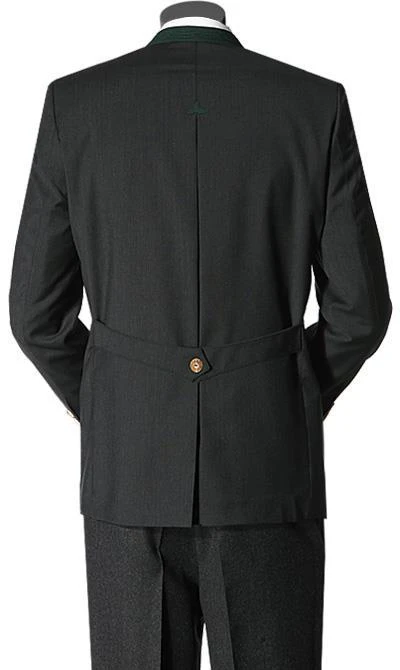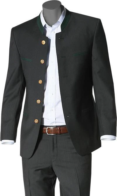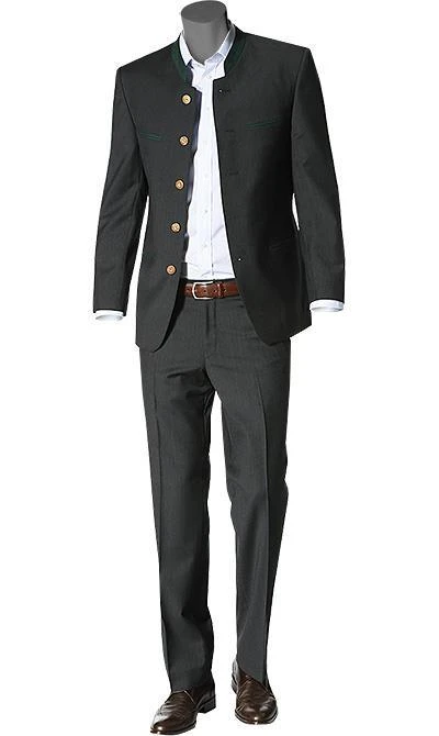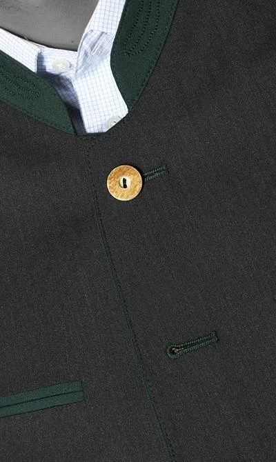 Diesen Anzug in klassischer Trachtenmanier können Sie im Baukasten-System zusammenstellen, also Sakko und Hose jeweils in der Größe, die für Sie am besten passt. Das Sakko ist im traditionellen Tegernseer Stil gearbeitet, mit farblich abgesetztem Stehkragen, Paspeltaschen, Rückenfalte mit Dragoner (geknöpfter Riegel im Rücken) und Hirschhornknöpfen. Die Hose ist eine normal geschnittene Flat Front, ohne Bundfalte, mit französischen Taschen und einer Gesäßpaspeltasche. Das Material für diesen Anzug ist vom Feinsten – Cool Wool das international anerkannte Gütesiegel der Wollvereinigung garantiert höchste Qualität. Der extrem feine beinahe kühle Griff entsteht durch die feinen, hoch gedrehten Garne.