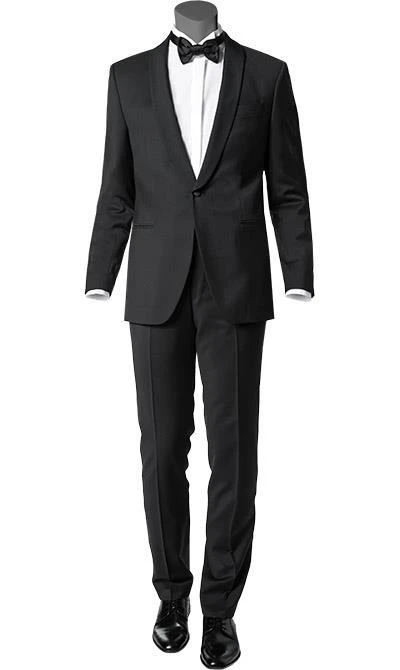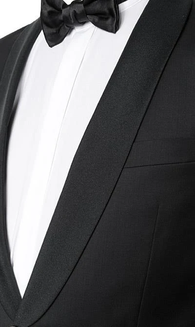 Dieser stilvolle Smoking präsentiert sich in hochwertiger Schurwolle. Die leicht schmale und taillierte Passform unterstreicht die modische Silhouette und ist absolut komfortabel. Ein exklusiver und außergewöhnlich chicer Anzug für Abendveranstaltungen.
