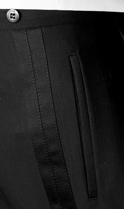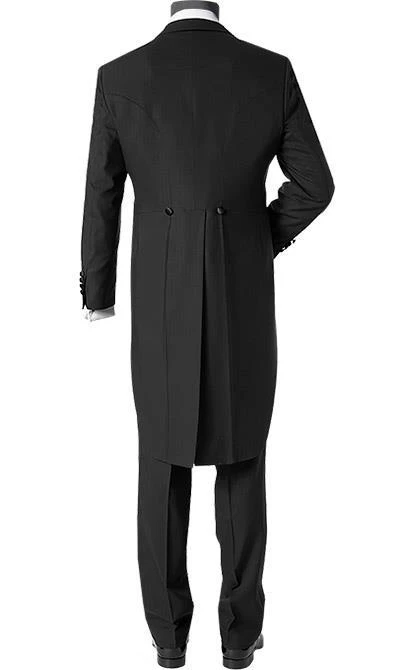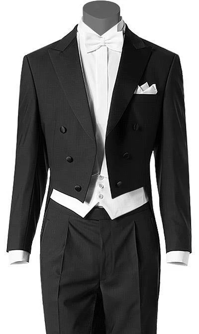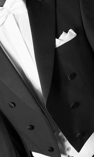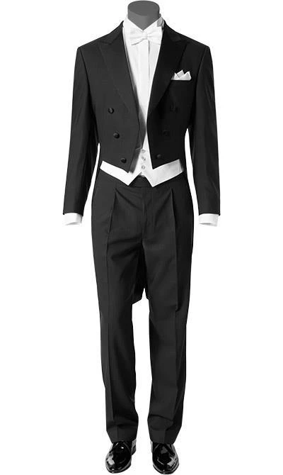 Der Frack ist der König der festlichen Herrenkleidung: Zeitlos, männlich, wertvoll – die offizielle Bekleidung für hochfestliche Anlässe. Dazu eine tief ausgeschnittene Piqué-Weste und ein Frackhemd mit Piquébrust in Weiß. Ein Muss ist die Schleife in Weiß und schwarze Lackschuhe.
