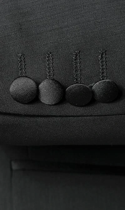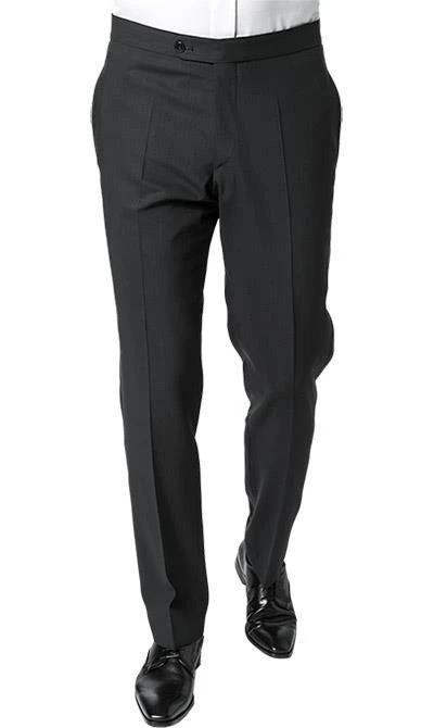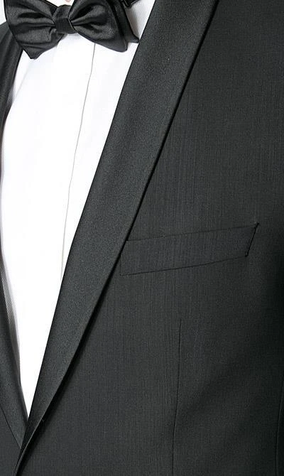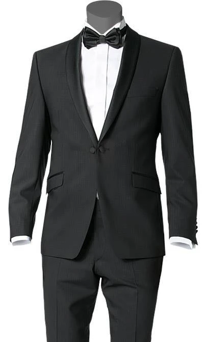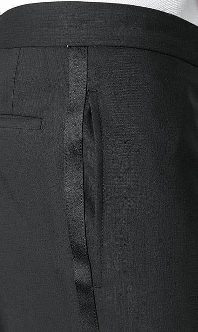 Ein luxuriöser Smoking – klassisch, aber dennoch außergewöhnlich. Modisch schmal geschnitten, mit Einknopf-Sakko, Schalkragen und dem klassischen Galon auf den Seitennähten der Hose. Material ist ein besonders leichtes, feines Schurwolltuch mit dezentem Webstreifen.